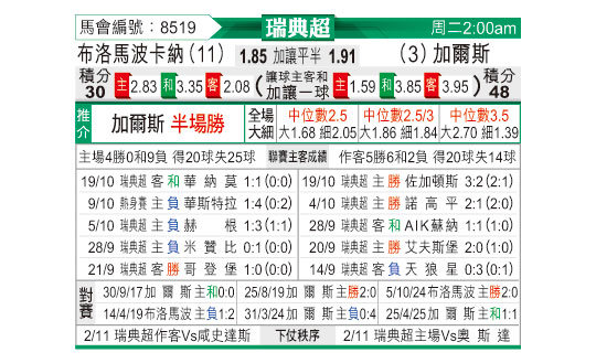 [瑞典超] 布洛马波卡纳vs哥德堡盖斯