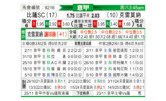 [意甲] 比萨vs克雷莫纳