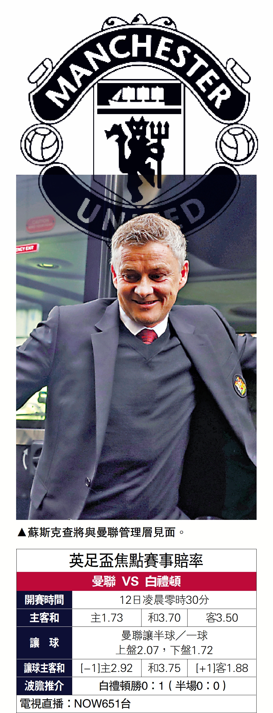 曼聯12日凌晨在足總盃第3圈對白禮頓,這將成為費查暫代領軍最後一戰,上仗他領軍未見起色,偏偏曼聯在足總盃抽中同為英超級數的對手,球隊未必及時回勇,或被白禮頓偷襲得手,宜捧主客和盤口的「客勝」。(NOW651台12日凌晨零時30分直播)